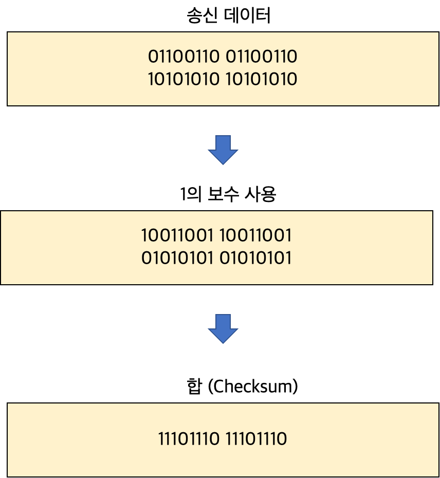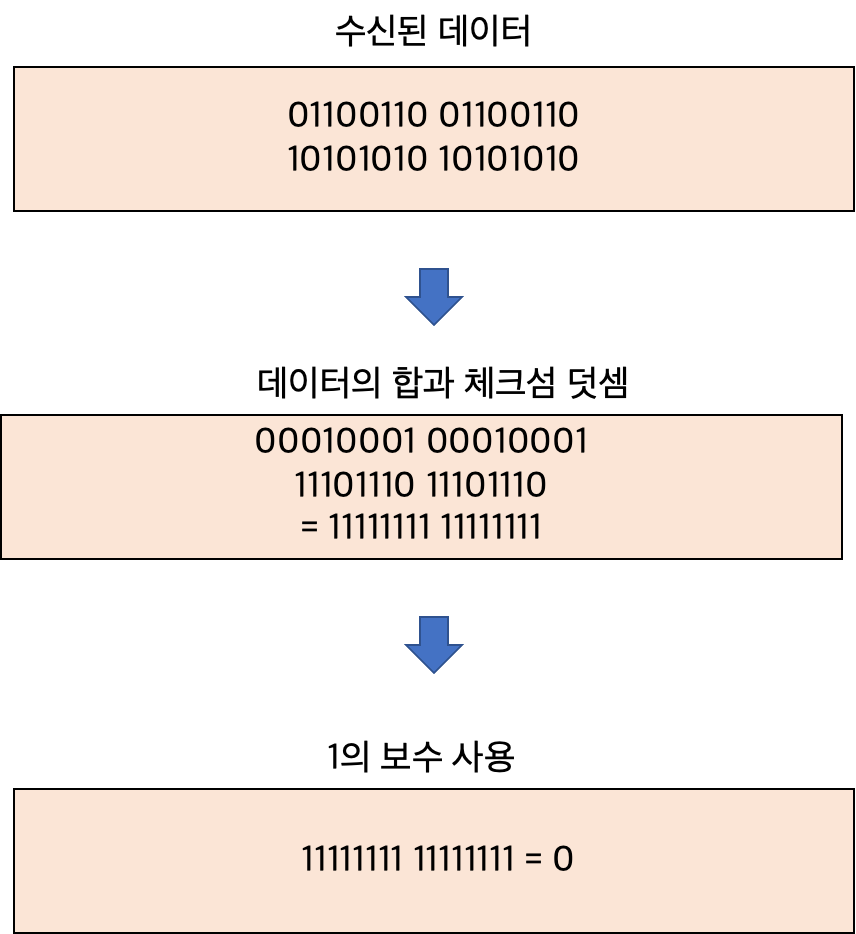 수신 호스트에서는 전송받은 세그먼트를 16비트 단위로 나누고 체크섬 필드를 포함하여 더 합니다.