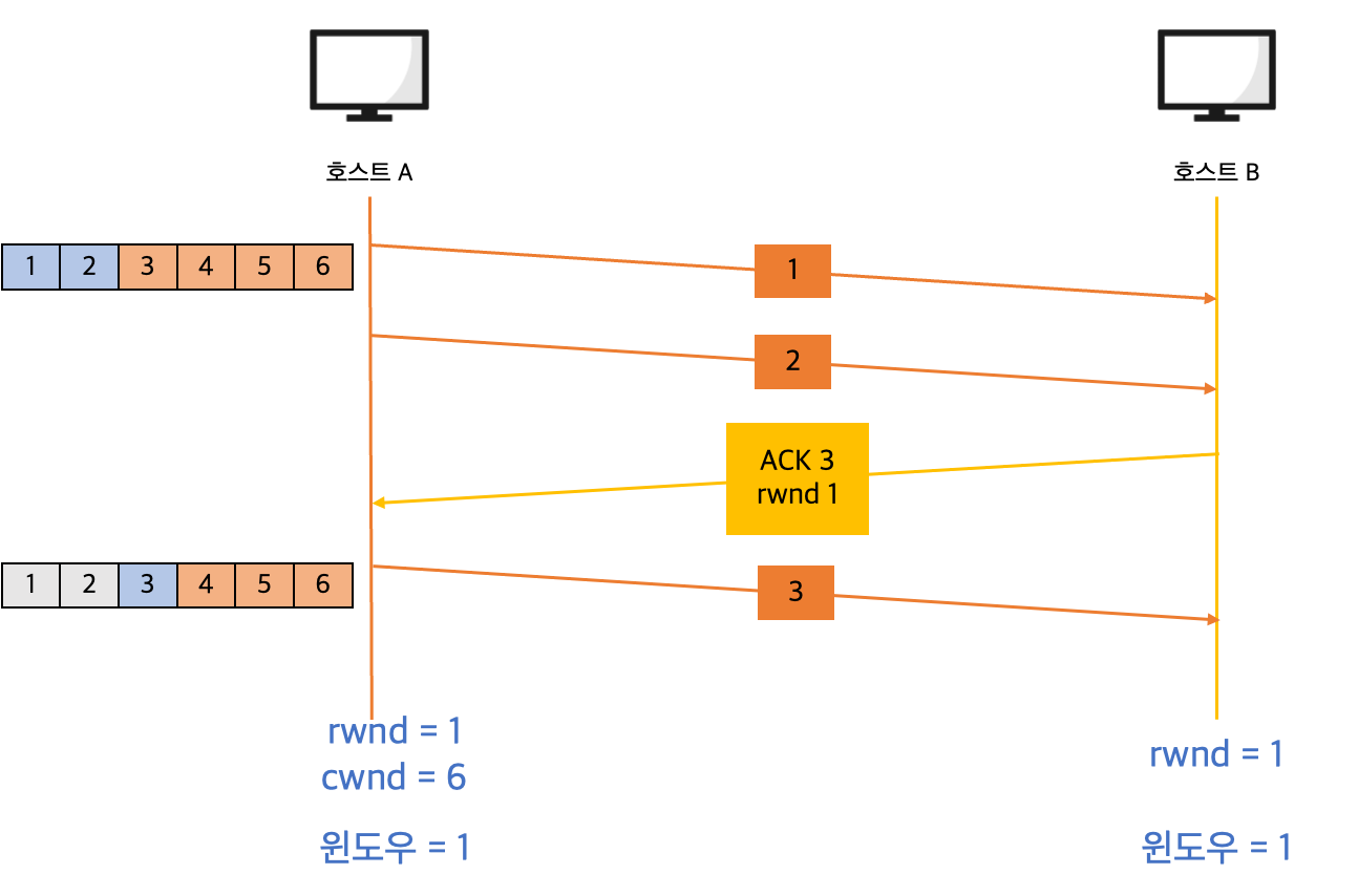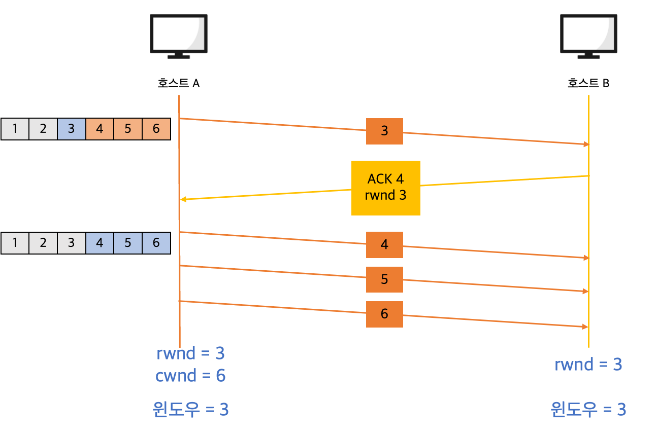 이번엔 rwnd가 3으로 변경되었고 호스트 A는 윈도우 크기를 3으로 조절하고 세그먼트를 보냅니다.