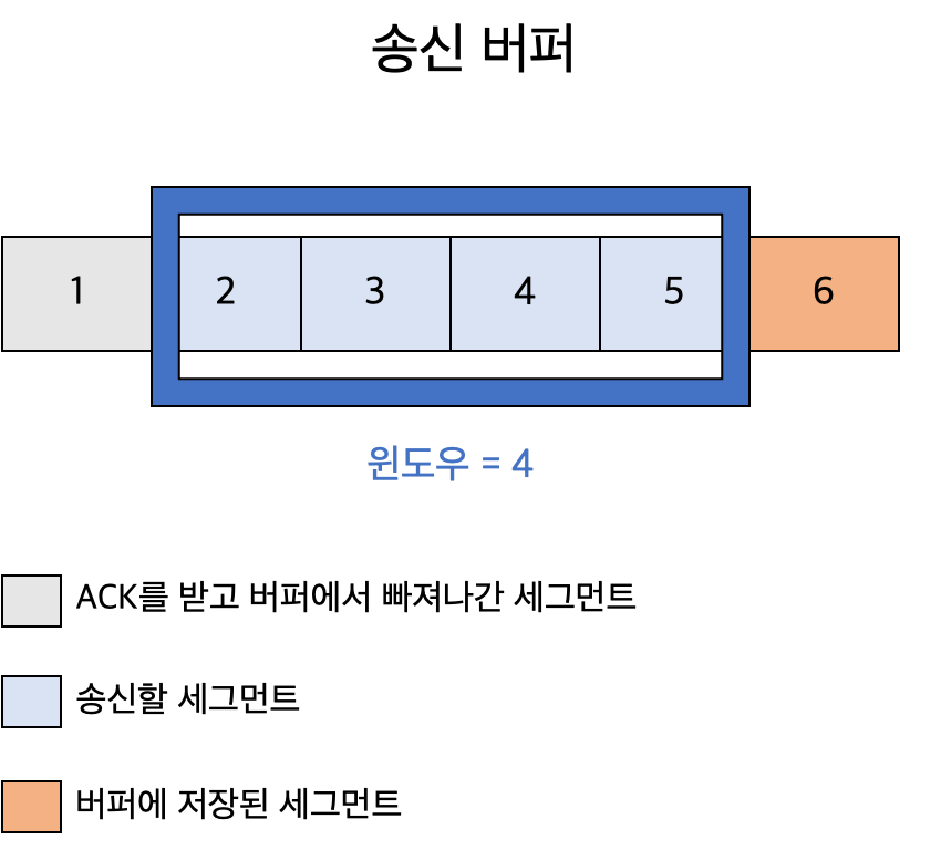 송신 호스트는 송신할 세그먼트를 송신 버퍼에 저장하였다가 송신 윈도우 크기 이내로 들어오면 세그먼트를 전송합니다.
